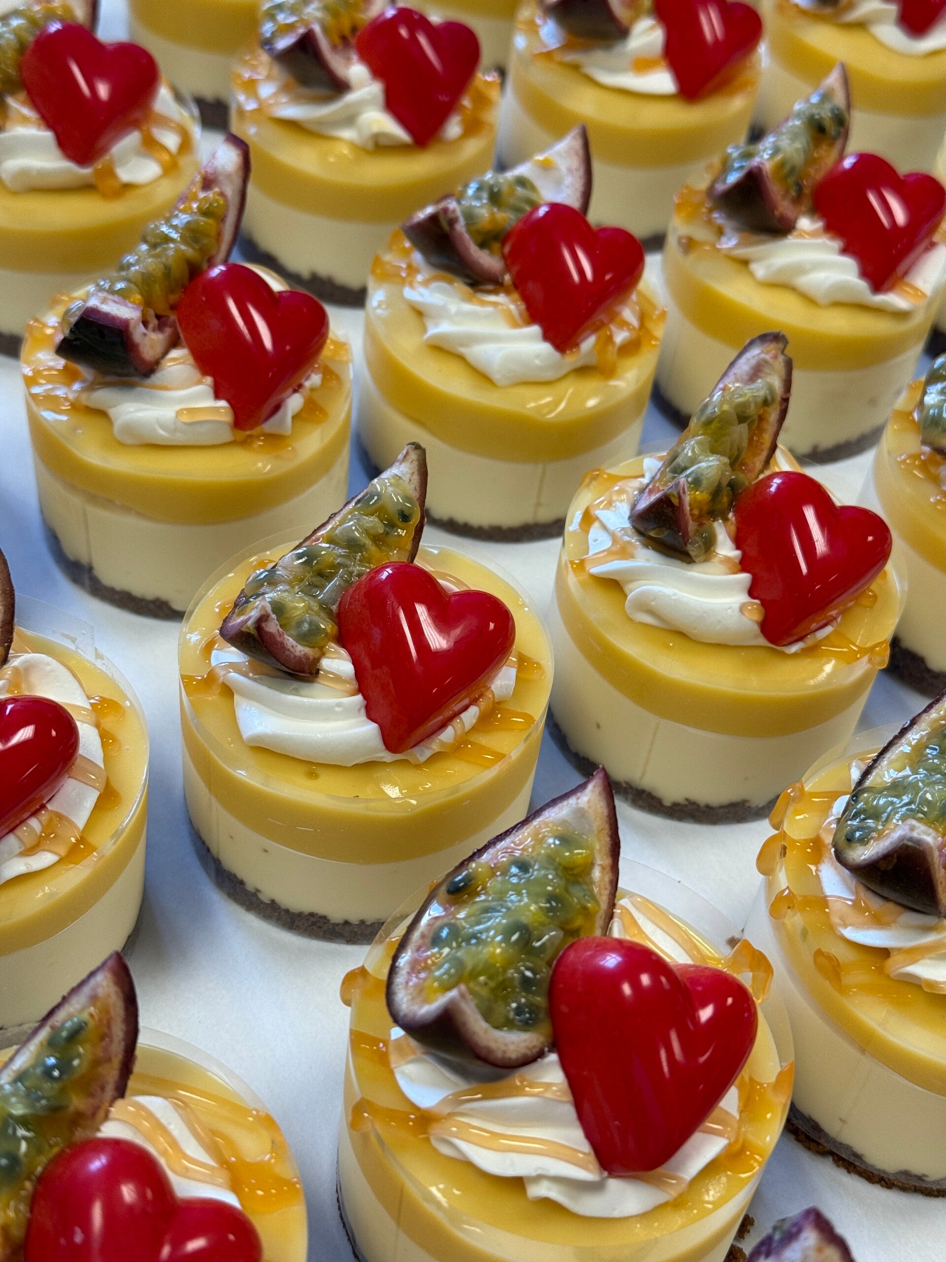 Een romige, verfijnde cheesecake van witte chocolade, gecombineerd met een fris-zure passievruchten curd dat perfect in balans is met de zoetheid van de cake.